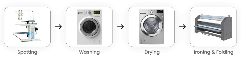 Our team of highly trained technicians can support a client in setting up an in-house laundry plant. With tie-ups with almost all the market leaders in laundry machine manufacturing and spare parts, we make sure you have the best-in-class unit up and running seamlessly.